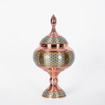 این ظرف علاوه بر ظاهر زیبا، کاربردی است و شما میتوانید برای سرو شکلات، نقل یا آجیلهای کوچک از آن استفاده کنید. ترکیب مس و خاتم، این محصول را به گزینهای ماندگار برای پذیرایی، دکوراسیون سنتی یا هدیهای فاخر تبدیل کرده است.