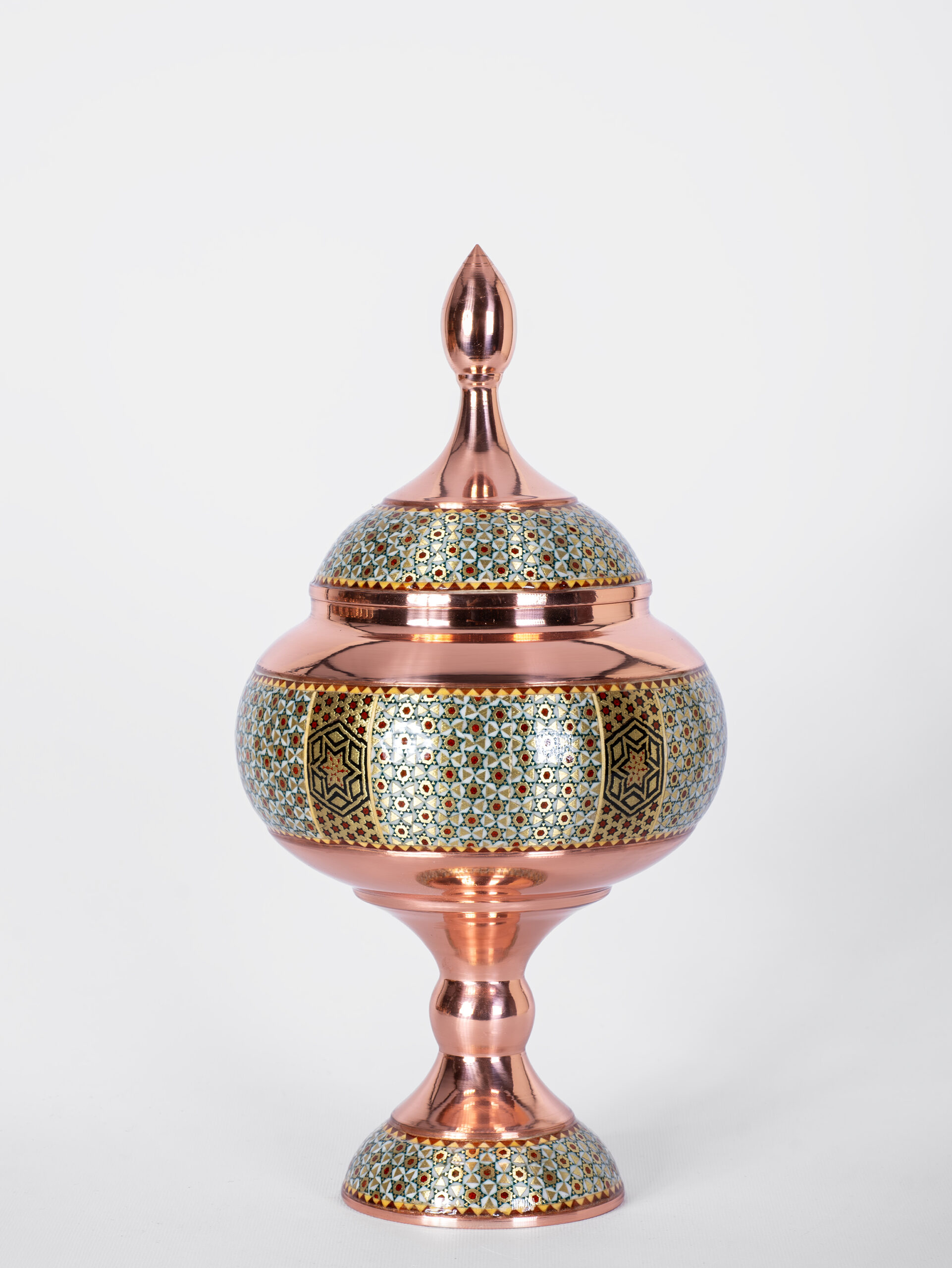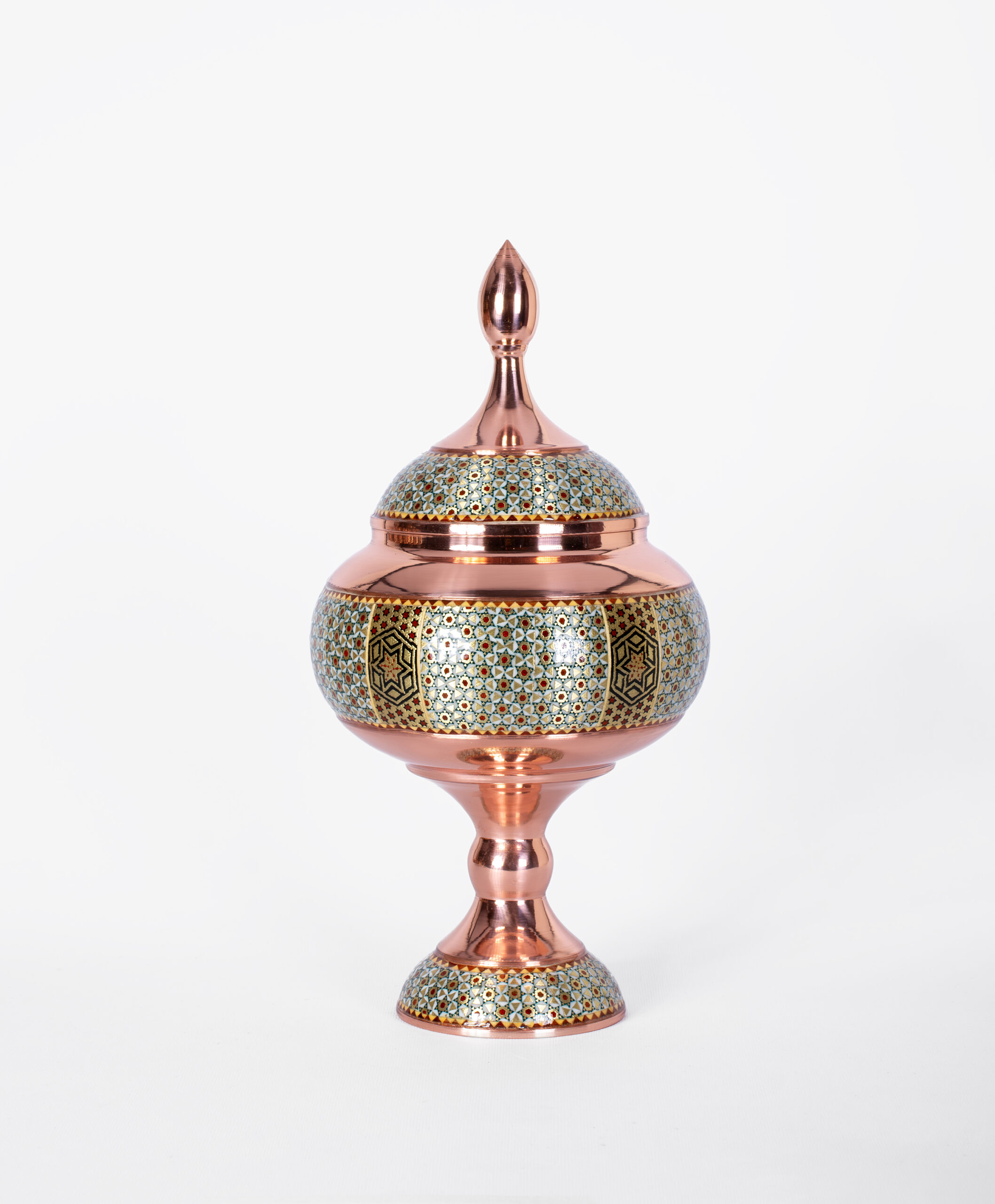 ظرف شکلاتخوری مس و خاتم، ساخته شده از ترکیب مس صیقلی و خاتمکاری دستساز ایرانی، انتخابی زیبا و کاربردی برای دکوراسیون و پذیرایی شیک.