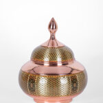 قندانی زیبا و سنتی ساخته شده از فلز مس با تزئینات ظریف خاتم‌کاری، انتخابی شایسته برای پذیرایی یا هدیه‌دادن.