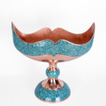 سنگهای فیروزه را با نظم و ظرافت روی بدنهی مسی چیدهاند تا نمایی یکدست و فاخر ایجاد شود. این ترکیب هماهنگ از آبی فیروزه و درخشش مس، حس سنتی و اصیل ایرانی را تداعی میکند.